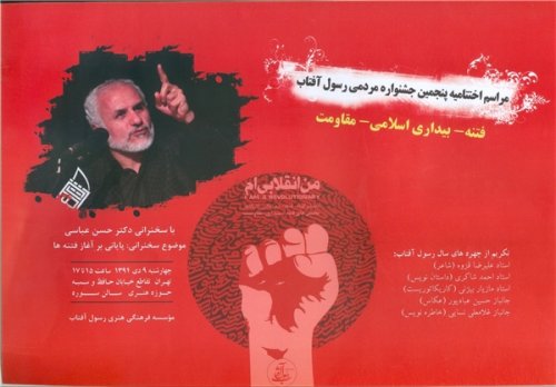 به گزارش هوران به نقل از فارس، پنجمین جشنواره مردمی رسول آفتاب که با شعار «من انقلابیام» و در سه محور: «فتنه 88 ـ بیداری اسلامی و مقاومت»، هنرمندان و نویسندگان بصیر کشور و فرهیختگان آزادهی جهان را به تولید اثر دعوت کرده بود، برگزیدگان خود را در مراسم اختتامیه که روز چهارشنبه 9دی برگزار خواهد شد معرفی میکند.